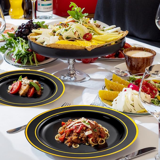 - VERSATILE: Due to its disposable nature,black disposable dinnerware set is suitable for most occasions,such as weddings,birthday parties,picnics,Halloween,etc. Of course,black and gold plastic plates are also very suitable for daily use,especially for people who like convenience