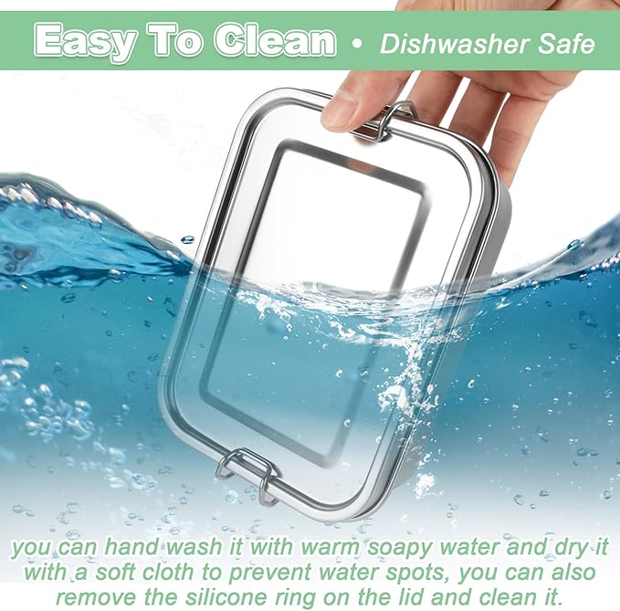 - Easy To Clean: Our stainless steel food containers is dishwasher safe, you can hand wash it with warm soapy water and dry it with a soft cloth to prevent water spots, you can also remove the silicone ring on the lid and clean it.Stainless steel lunch box containers is reusable, more worthy than disposable one