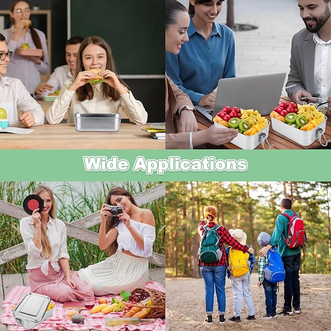 - Wide Applications: Stainless steel bento box for adult is suitable for protein, veggies, fruits, salads, biscuits, and snacks. You can also put sandwiches and vegetable salad in it when traveling, family car trips!