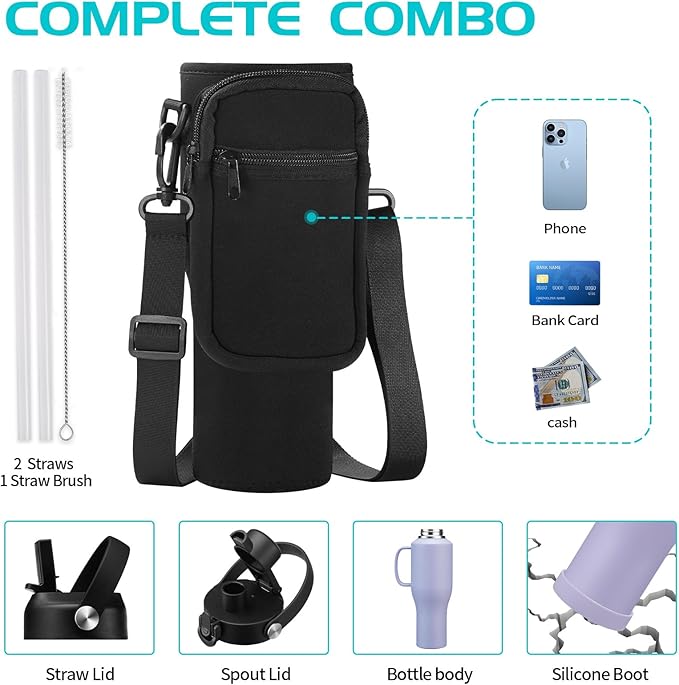 - √ EXTRA PROTECTION & STORAGE (carrier bottle bag & protective boots): The water bottle carrying pouch with strap made of neoprene, which provides extra insulate and full-protect for your stainless steel tumbler 40oz with handle. The water bottle silicon boot reduce noisy and protect bottle bottom and your table when place your cup on your table.