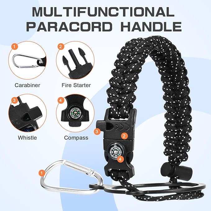 - Full-function Paracord - With brilliant matching colors brings a touch of youthful vibe to the 40 oz water bottle. As a sturdy survival handle it comes with a carabiner, compass, fire starter and whistle, perfect for your wild adventures hiking camping fishing.