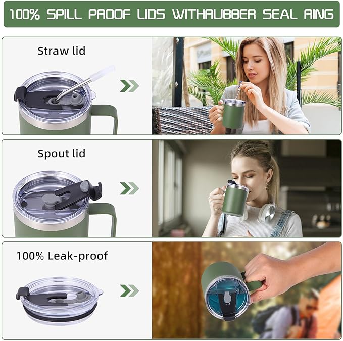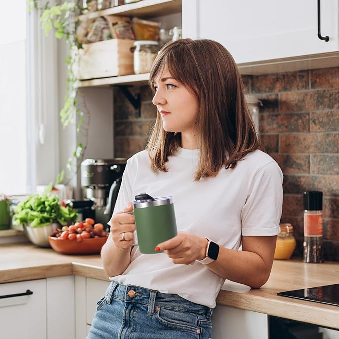 Volhoply 12oz Insulated Leakproof Coffee Mug with Flip & Straw Lid Bulk 8 Pack,Double Wall Vacuum Stainless Steel Travel Tumbler Cup with Handle,Reusable Camping Mugs Keep Cold(Army Green,8 Set)