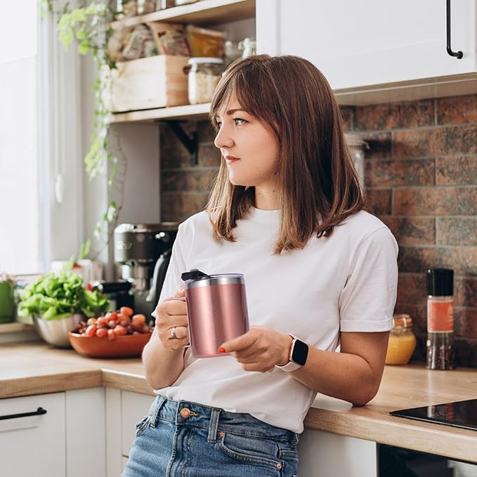 Volhoply 12oz Insulated Leakproof Coffee Mug with Flip & Straw Lid Bulk 4 Pack,Double Wall Vacuum Stainless Steel Travel Tumbler Cup with Handle,Camping Mugs Keep Cold/Hot(Rose Gold,4 Set)