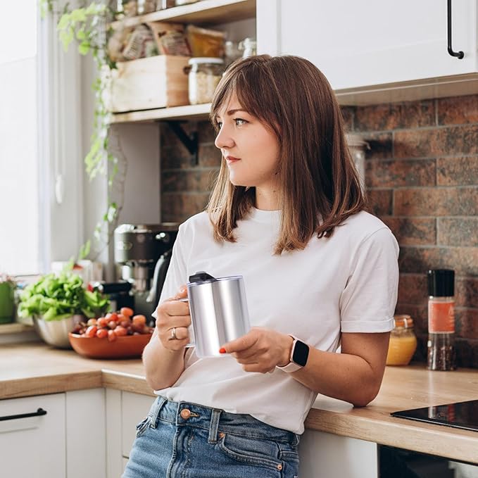 Volhoply 12oz Insulated Leakproof Coffee Mug with Flip & Straw Lid Bulk 2 Pack,Double Wall Vacuum Stainless Steel Travel Tumbler Cup with Handle,Reusable Camping Mugs Keep Cold/Hot(Silver,2 Set)