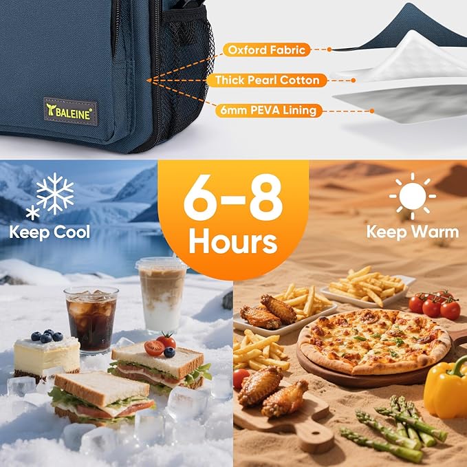- [PREMIUM MATERIAL] Our BALEINE insulated lunch bag features advanced thermal insulation technology, providing exceptional temperature control to keep your meals hot or cold for extended periods. The high-quality 600D polyester fabric of the lunch bag is tear-resistant, ensuring longevity and durability.