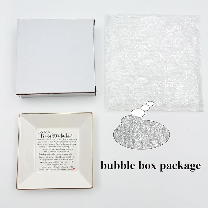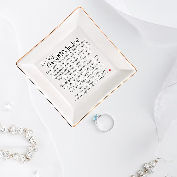 - Daughter in Law Gift from Mother in Law: Daughter in law-themed ring dish can be given as a gift to your daughter in law on wedding day, birthday, Mother’s day and Thanksgiving day, so on. Every time she uses this jewelry tray, she will feel your love through the warm letters.