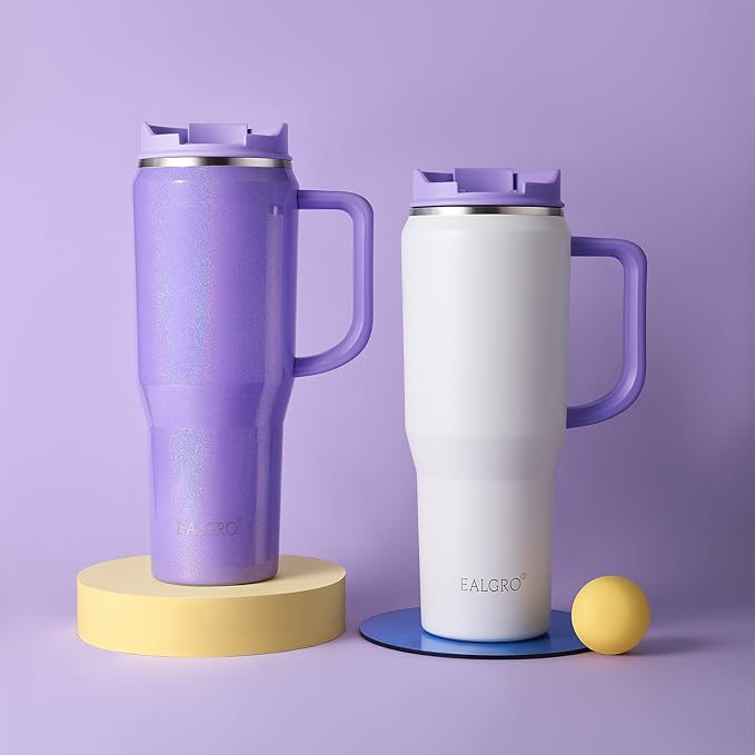 - INSULATED TUMBLERS: EALGRO 50 oz tumbler with handle are made with double-walled vacuum food-grade stainless steel, our hot and cold tumblers keeps your favorite beverages HOT for 12 hours and COLD for 34 hours, and ice lasts overnight