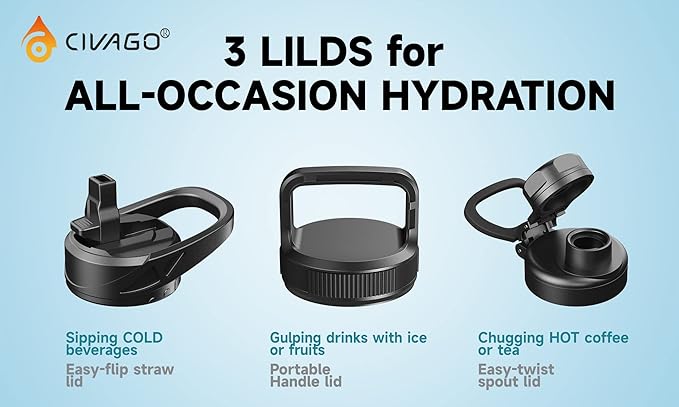 - INSULATED WATER BOTTLE: Featuring advanced vacuum insulation technology, CIVAGO large half gallon water bottle keeps your drink HOT for 12 hours and COLD for up to 24 hours, allowing you to enjoy icy cold drinks after intense workouts or hot coffee while winter camping