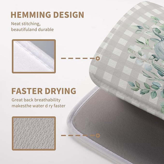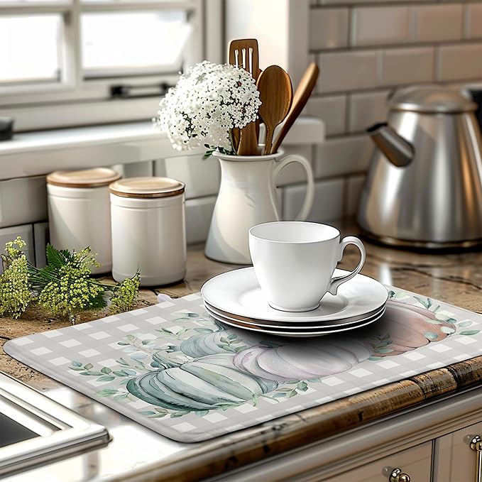 - [Multi-functional]: This Thanksgiving Fall pumpkin white check plaids dish dryer mat can be placed under the dish rack to collect dripping water to keep the counter dry and clean, or you can place bottles, pots, plates, bowls, cups and other utensils directly on the mat. Thanksgiving Fall pumpkin dish drying Pads can also be placed under the coffee machine to absorb spilled coffee.