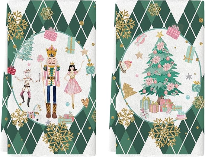 Artoid Mode Green Nutcrackers Tree Christmas Kitchen Towels Dish Towels, 18x26 Inch Gift Box Snowflake Winter Decoration Hand Towels Set of 2