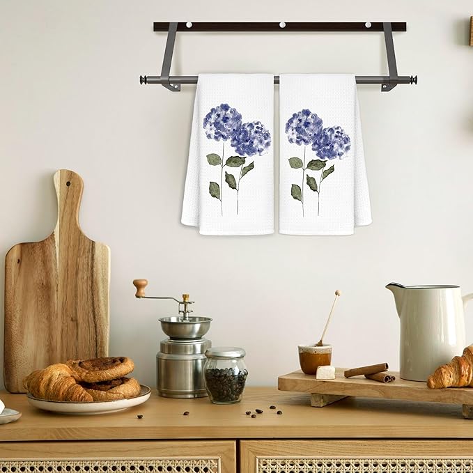 Purple Hydrangea Flowers Floral Kitchen Towels Set of 2 - Summer Flowers Decorative Hand Towels for Bathroom, Green Hydrangea Decor Dish Towels for Kitchen, Floral Hand Towels, 16x24