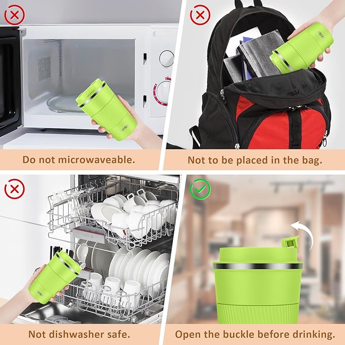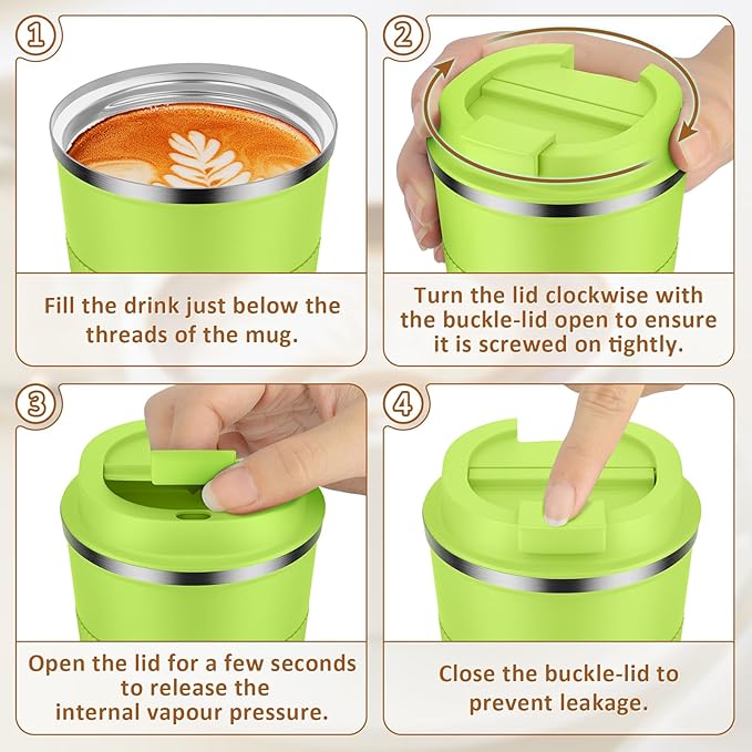 - 【Leakproof Design 】 Built to house 12 oz of your favorite cold or hot drinks, this is one coffee cup with seal lid preventing from leak or spilling (The coffee mug buckle has been closed tightly after two "clicks"). Compact body design makes this coffee travel mug fits most coffee makers.