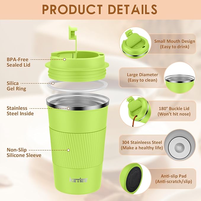 - 【 Cupholder Frindly and Portable 】 5.7 inches height, 3.6 inches base width and an anti-slip rubber cushion make KETIEE reusable coffee cup with lid not only fit most cupholders, but also easy to grab and go. The sip hole on the top of the lid can let you enjoy your coffee conveniently with one hand.