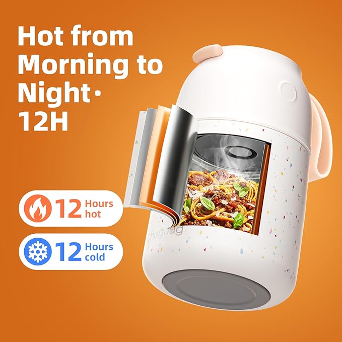- ONE CONTAINER INCLUDES ALL,KID-FRIENDLY : The kids thermo food container is lightweight, not bulky, and easy to carry. It has a built-in foldable stainless steel spoon, and the lid can be used as a bowl. Whether it is camping, traveling, or taking it to the office or school. You only need one ChugJug soup thermo to have a meal, Just enjoy your delicious meals