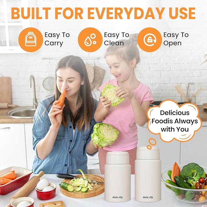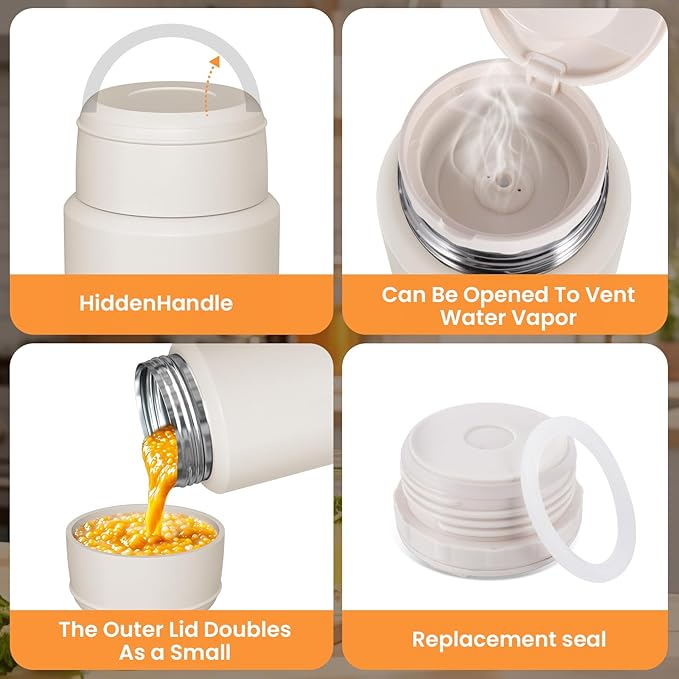 - 【EXCELLENT CRAFTSMANSHIP】The double-layer lid design enhances heat preservation. The outer lid doubles as a small bowl, while the inner lid features a sealing rubber ring to prevent leakage and overflow. The outer lid includes a carrying handle for easy carry. The inner lid is designed to be opened, allowing water vapor to be released through the pressure relief plug promptly. This design keep that the jars will stay dry and clean when not in use.