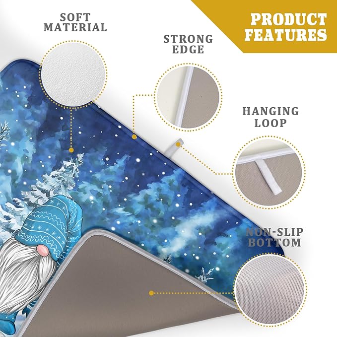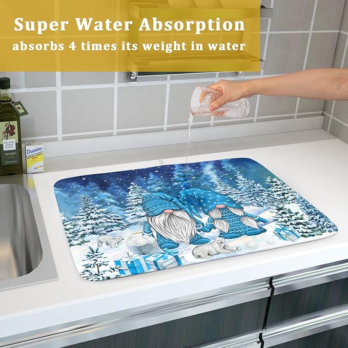 Winter Blue Gnome Dish Drying Mat for Kitchen Counter Pine Tree Microfiber Dish Pad Absorbent Reversible Fast Dry Draining Mats 18x24 Inch