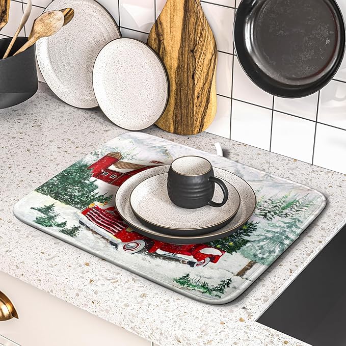 Winter Red Truck Dish Drying Mat Christmas Tree Dishes Pad 16x18 Inch Dish Drainer Rack Mats Absorbent Fast Dry Kitchen Holiday Accessories