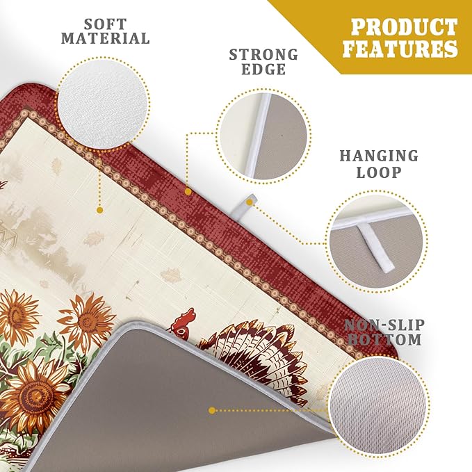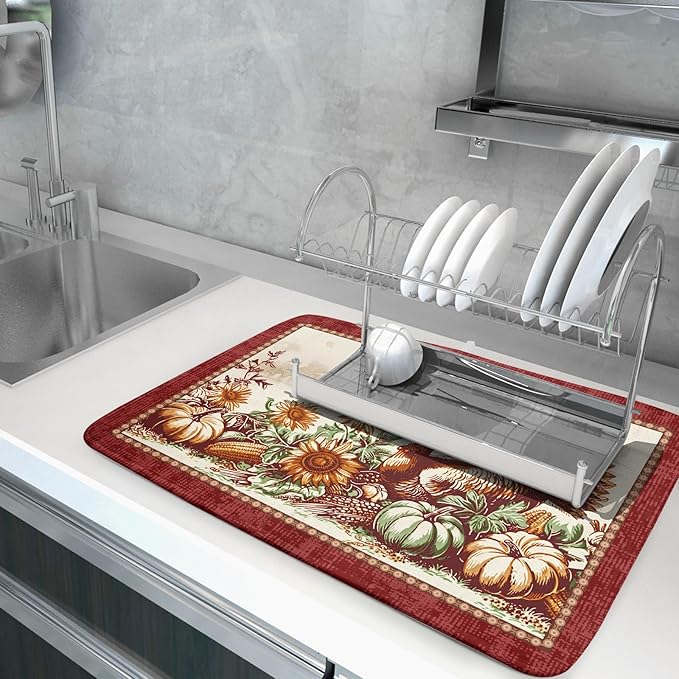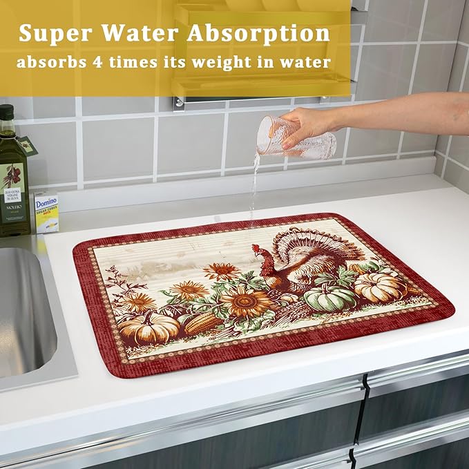 Rustic Turkey Dish Drying Mat for Kitchen Countertop 18x24 inch Fall Thanksgiving Pumpkin Sunflowers Harvest Dish Drainer Mats Fast Drying Farmhouse Country Style Dish Drying Pad Holiday Decor Large