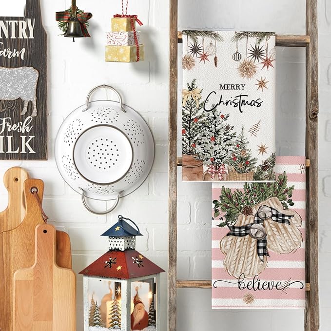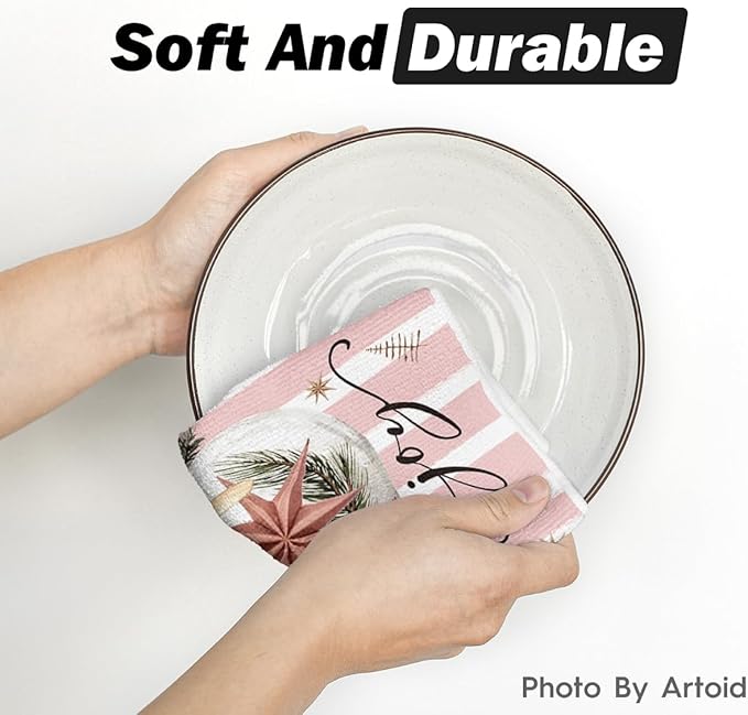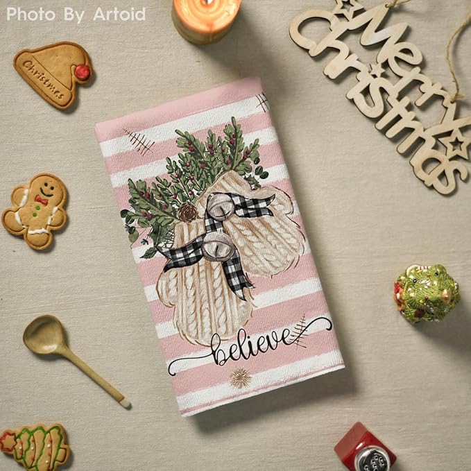 Artoid Mode Pink Xmas Tree Merry Christmas Kitchen Towels Dish Towels, 18x26 Inch Holiday Gloves Ball Hello Winter Decoration Hand Towels Set of 4