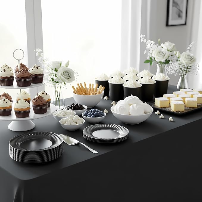 - Stylish, Not Fragile: Featuring a classic round silhouette with a subtle fluted rim and shiny black finish, these plates mimics the elegance of ceramic in slim, durable melamine form without the worry of chips or cracks during transport or use at parties or everyday meals.