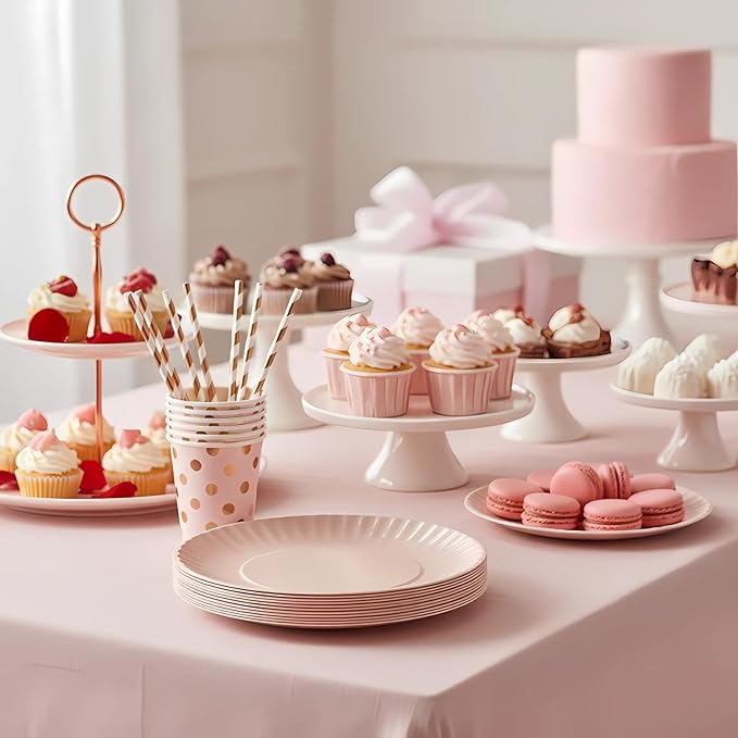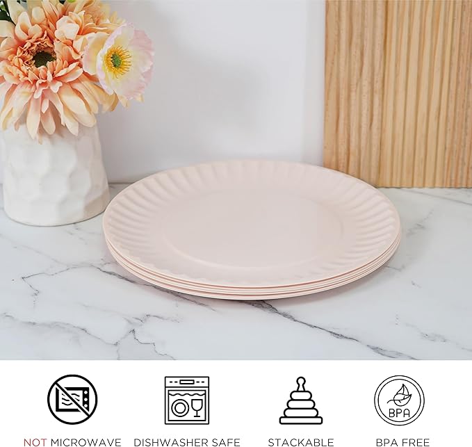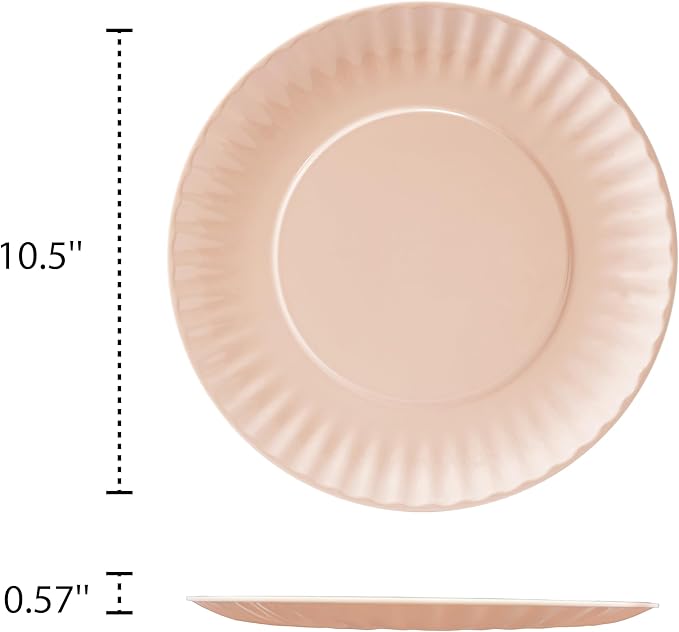 - Stylish, Not Fragile: Featuring a classic round silhouette with a subtle fluted rim and shiny pink tone, these plates mimics the elegance of ceramic in slim, durable melamine form without the worry of chips or cracks during transport or use at parties or everyday meals.