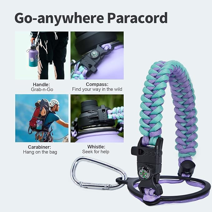- Palm Fitting Paracord Handle: Compared to handle lids, nylon paracord on the bottle gives you more choices in terms of color coordination and coziness on your hands. Match the handle with your bottle to make a complete outdoorsy look. Compass and carabiner can be lifesavers for hiking and other expeditions