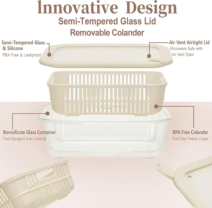 - ✅LEAK PROOF AIR VENT LID: Our new Glass Lid Food Storage is the best choice for daily life. Every piece of our food container set is BPA Free, EASY LEAK PROOF LID - simply close the lid, press the lid and lock air vent. Our new air vent design makes kitchen life much easier. Removable Colander provides additonal funtion to keep produce fresher longer in the fridge.