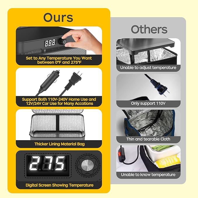 - Upgraded Adjust Temperature Digital Display Portable Oven: the Heated Lunch Box supports Intelligent Adjustable Temperature and Digital Display, you can directly to notice the temperature in the box, it adopts advanced conduction heat technology to ensure that your meals are cooked evenly, without drying them out, the heated lunch box retain their moisture and freshness. to adjust the temperature to satisfied difference food heating Temperature Requirements, also can avoid burn.