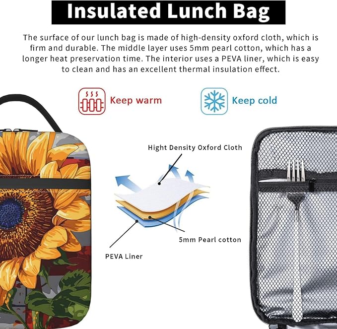 - Material :Sunflower lunch bag is made of high density Oxford cloth and heavy aluminum foil. 10 X 8x 4 inches keeps food hot/cold for hours, and our insulated lunch bags keep your food/drink at optimum temperature.