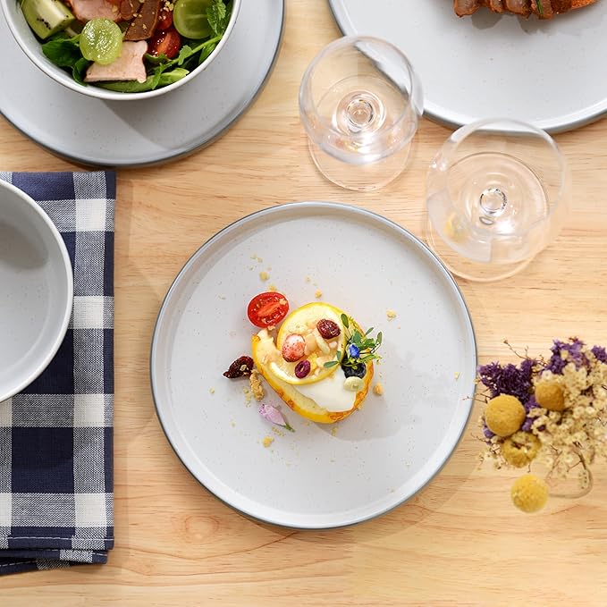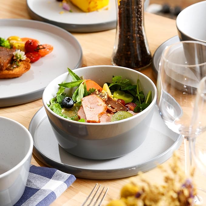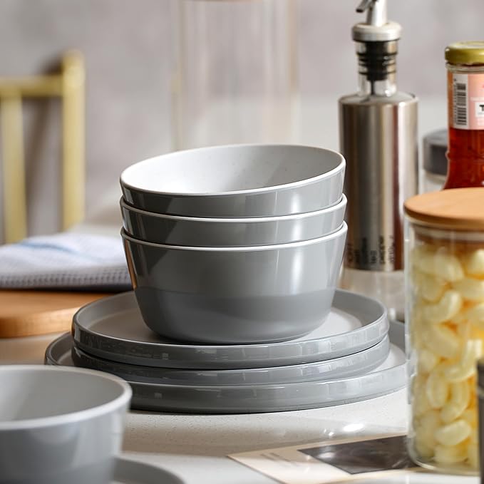 - UNIQUE TWO-TONE DESIGN: Melamine dinnerware sets present a deep and elegant light gray appearance, just like a tranquil painting. The interior is white with delicate spray dots, like stars or sea ripples. These dots show the uniqueness and add artistic vitality. Placed on the table, they give an artistic atmosphere instantly.