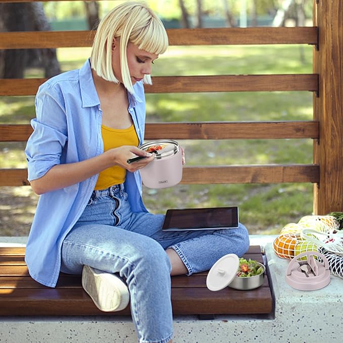 - The interior of the food thermo is completely made of food-grade double-wall vacuum insulated stainless steel. The heat resistance insulation technology keeps the food hot for 6 hours or cold for 8 hours. No matter where you are at lunch time, you can enjoy warm food and soup!