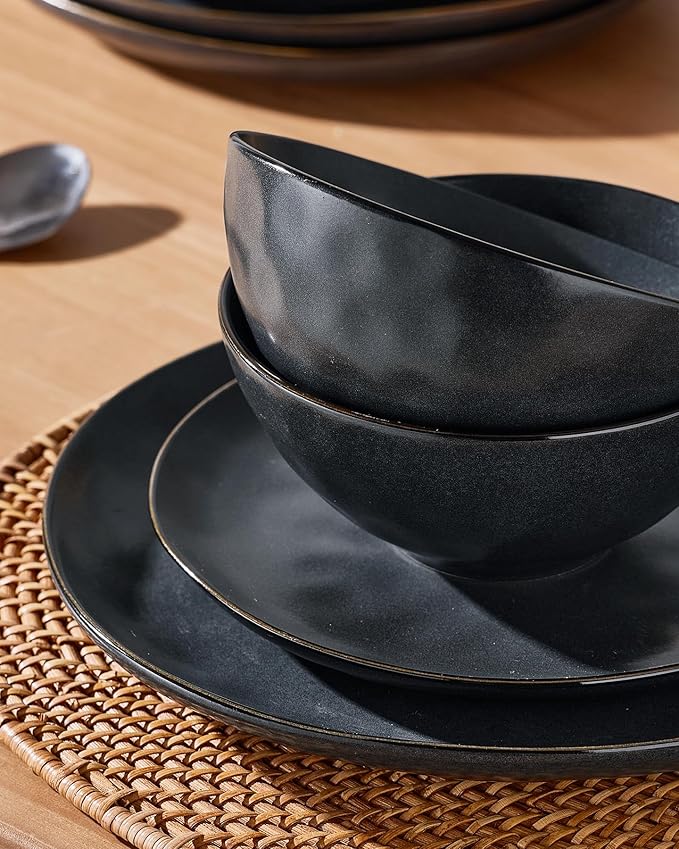 Famiware Dinnerware Sets for 4, Ocean Round 12-Piece Kitchen Plates and Bowls Sets, Microwave and Dishwasher Safe, Scratch Resistant, Matte Black