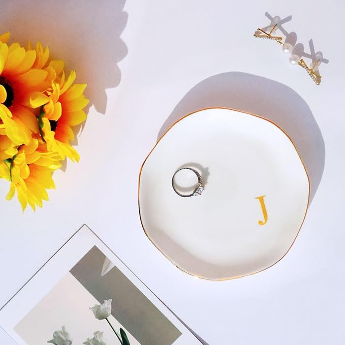 Ceramic Jewelry Tray Initial Ring Dish Personalized J-Monogrammed Engagement Wedding Gifts, for Birthday Mother's Day Christmas for Women, Ceramic White 4.75" (J)