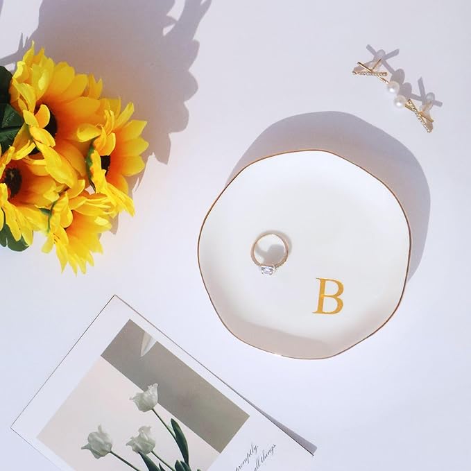 Ceramic Jewelry Tray Initial Ring Dish Personalized B-Monogrammed Engagement Wedding Gifts, for Birthday Mother's Day Christmas for Women, Ceramic White 4.75" (B)
