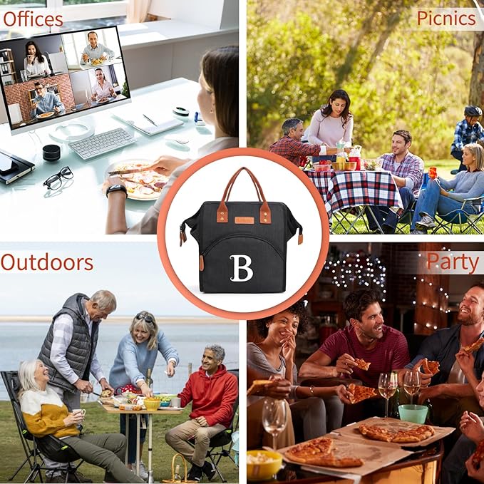 Personalized Lunch Box for Women, Initial Reusable Insulated Lunch Bag, Wide-Open Adult Lunchbox Cooler Lunchbag Snack Organizer, Initial Leakproof Lunch Tote Bag for Picnic Work Outdoors Black -B
