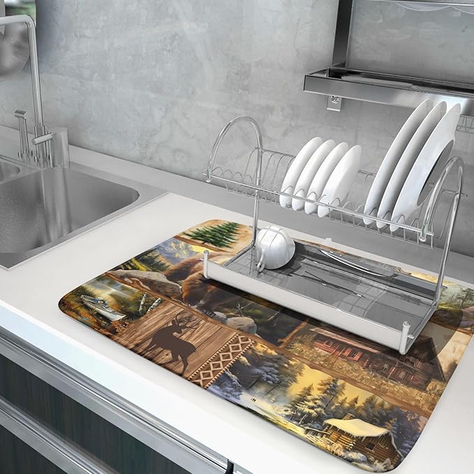 Bear Deer Fox Dish Drying Mat Rustic Cabin Lodge Dish Drainer Mats 18x24 Inch Absorbent Washable Dishes Rack Pad for Sink Kitchen Counter