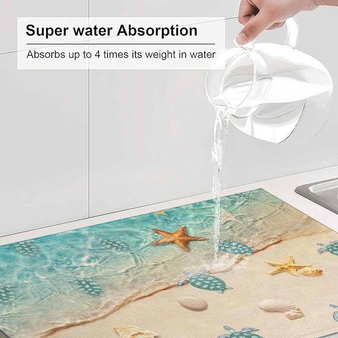 Sea Turtles Beach Dish Drying Mat for Kitchen Counter Cute Drying Pad 18x24 Inch Teal Nautical Decor Absorbent Reversible Dish Drainer Rack Mats