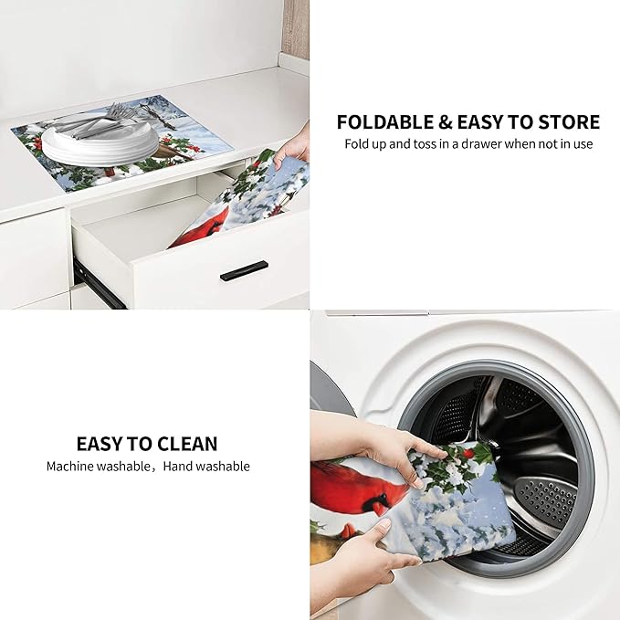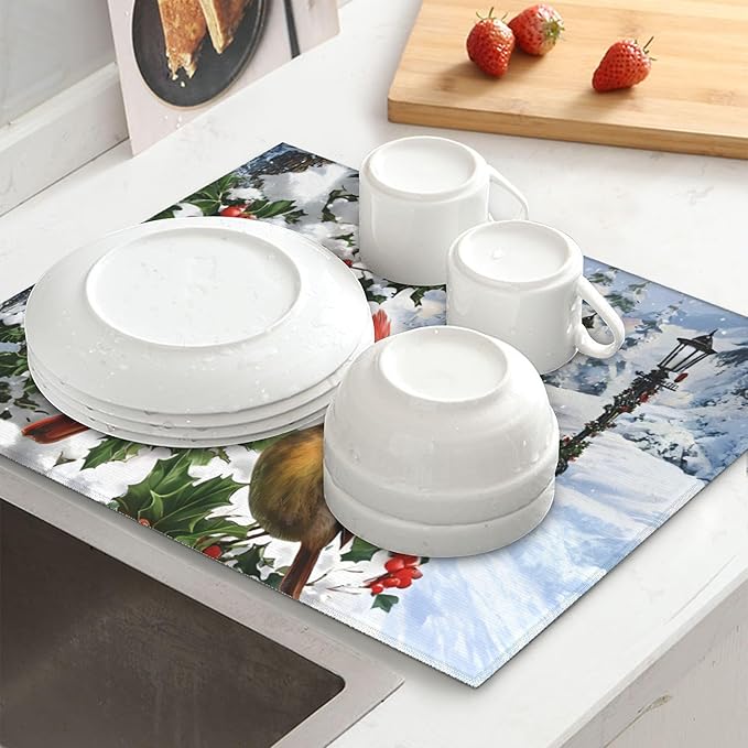 Winter Cardinal Birds Dish Drying Mat for Kitchen Counter Washable Dish Drying Racks Absorbent Reversible Microfiber Dishes Drying Pad Christmas Kitchen Accessories or Decor 16"x18"
