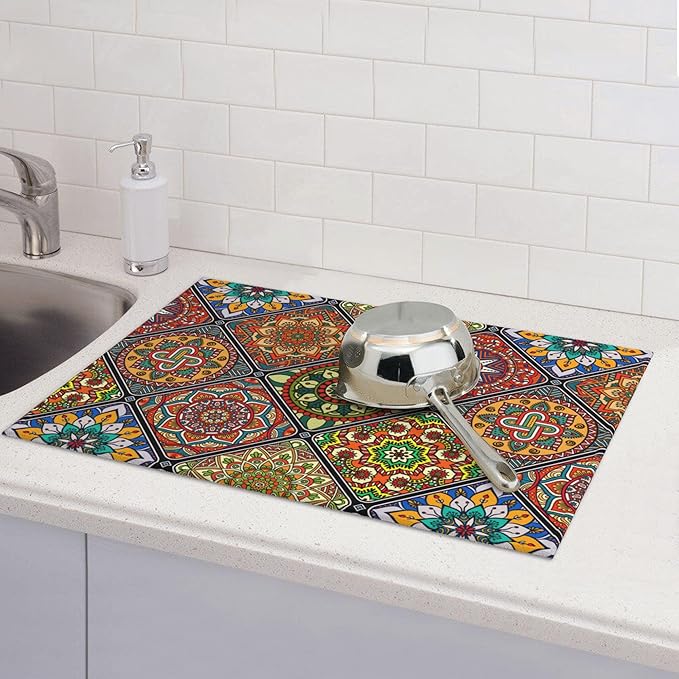 Retro Dish Drying Mat for Kitchen Counter Mandala Colorful Dish Drainer Rack Mats Boho Decor Washable Absorbent Reversible Microfiber Drying Pad Kitchen Accessories 18"x24"