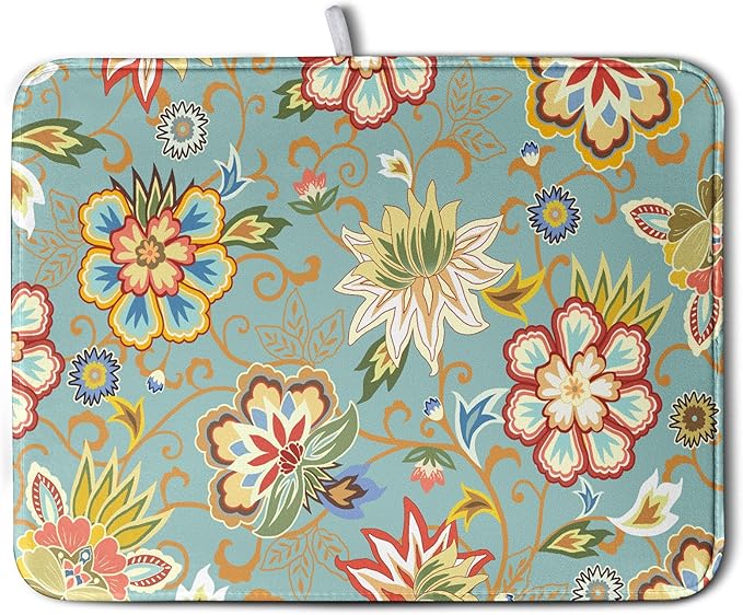 Boho Floral Kitchen Dish Drying Mat for Dishes 16x18 Inch Vintage Mandala Colorful Flowers Drying Mat Green Bohemian Dish Drainer Mat Super Absorbent Dish Rack Pad for Coffee Bar Sinks