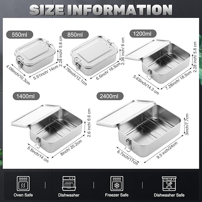 - Portable and Suitable Sizes: the stainless steel lunch container has a compact and portable design, making it easy to take outside; The containers come in 4 different sizes about 18.6 oz/ 550 ml, 28.7 oz/ 850 ml, 40.58 oz/1200 ml, 47 oz/ 1400 ml, 81 oz/ 2400 ml in capacity; Its convenient size and shape fit well in most lunch bags, briefcases, and backpacks, allowing you to enjoy your meals anytime, anywhere