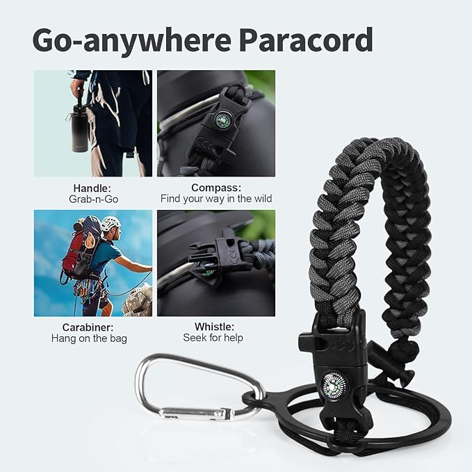- Palm Fitting Paracord Handle: Compared to handle lids, nylon paracord on the bottle gives you more choices in terms of color coordination and coziness on your hands. Match the handle with your bottle to make a complete outdoorsy look. Compass and carabiner can be lifesavers for hiking and other expeditions