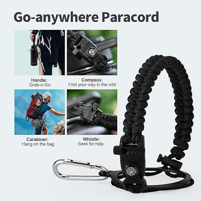 - Palm Fitting Paracord Handle: Compared to handle lids, nylon paracord on the bottle gives you more choices in terms of color coordination and coziness on your hands. Match the handle with your bottle to make a complete outdoorsy look. Compass and carabiner can be lifesavers for hiking and other expeditions