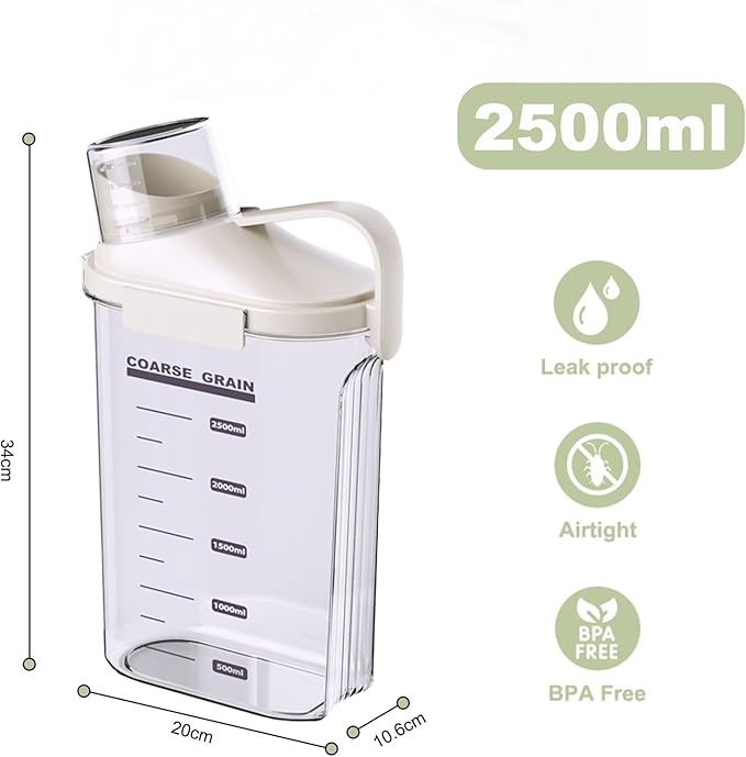 - Bpa Free, Food Grade Plastic: Crafted from high-quality, food grade materials, these clear dry ingredients storage containers are designed to be durable and safe for storing dry products. ATTENTION: PACKAGE INCLUDES: 2 x 2500ML CEREAL DISPENSER(White).