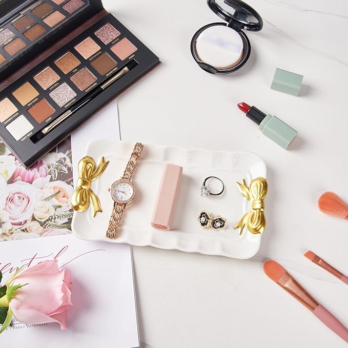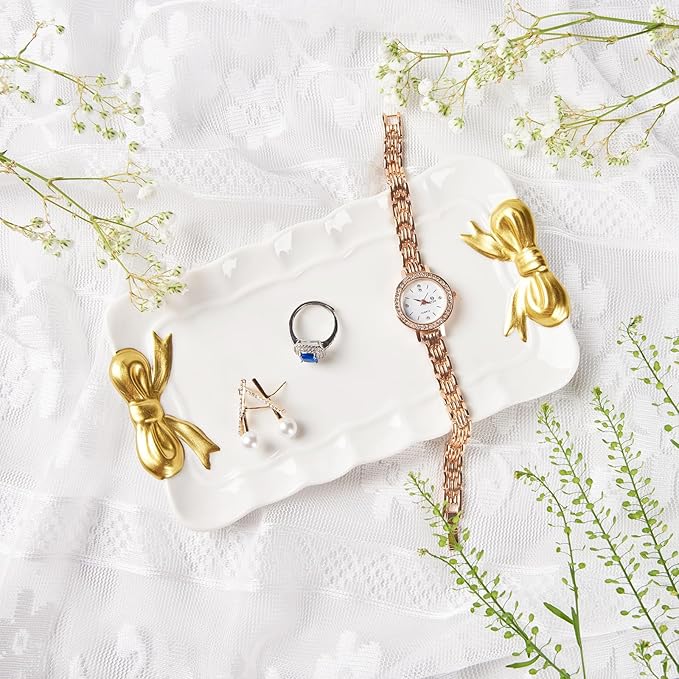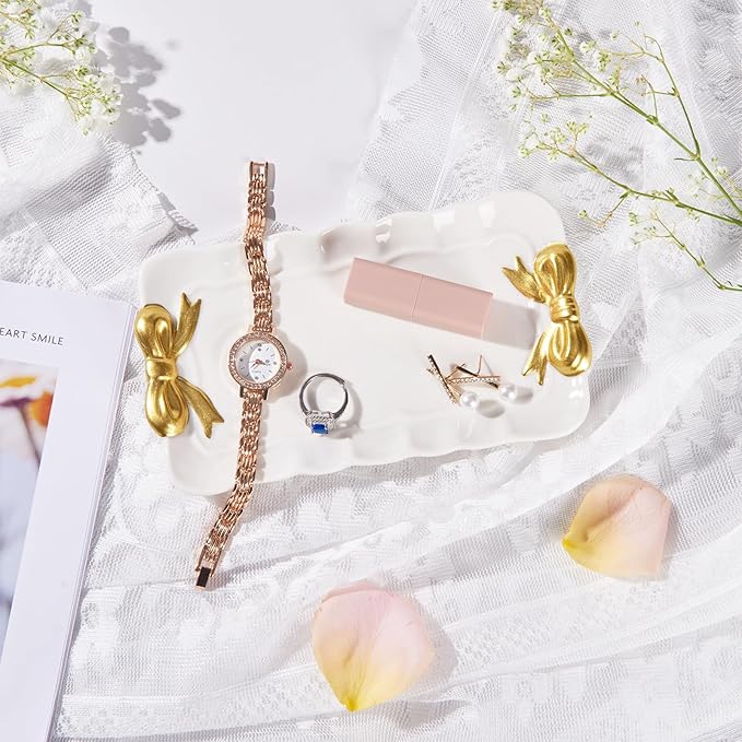 Bow Jewelry Tray Ceramic Trinket Dish for Rings Earrings Necklaces Bracelet Watch Keys, Ring Dish Plate Key Bowl Room Decor Aesthetic Vanity Perfume Tray, Gifts for Women, 6.69"