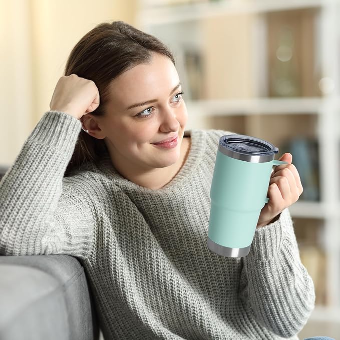 - Stainless Steel Tumblers with Handle:The 20oz coffee mug is made of thickened 304 stainless steel, liner of coffee mug will not produce any taste and will not rust.The cup comes with a sturdy welded handle for easy grip and ease of use