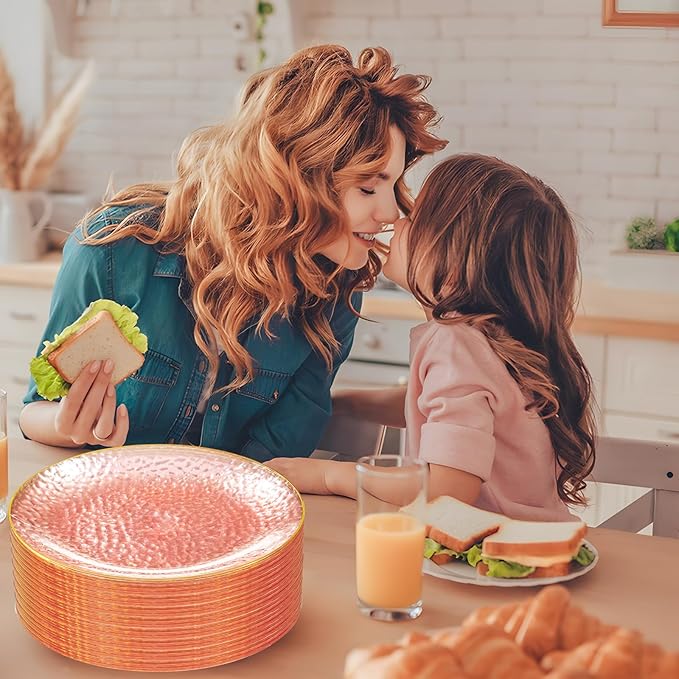 - Elegant Design: Elevate your dining experience with our 10-inch clear pink plastic plates featuring a stunning gold rim. The hammered texture adds a touch of sophistication, making these pink plastic plates the perfect choice for any occasion.