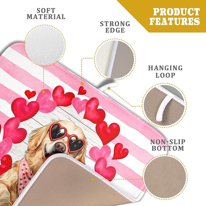 Valentine's Day Dog Dish Drying Mat for Kitchen Counter 16x18 inch Heart Rose Absorbent Dish Drainer Rack Mats for Coffee Bar Countertop