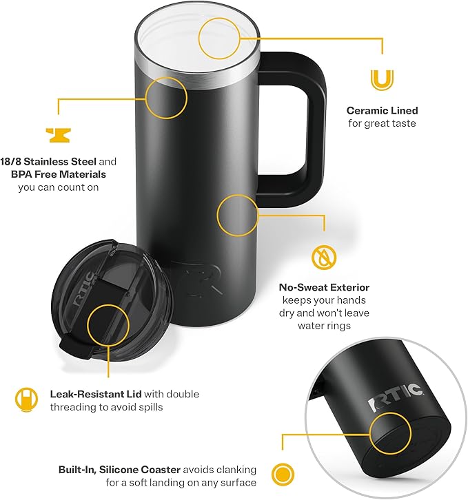 - DURABLE STAINLESS STEEL CONSTRUCTION: Crafted from 18/8 stainless steel and BPA-free materials, this metal travel mug is built to last; its durable design is RTIC tough, providing reliability and quality you can count on