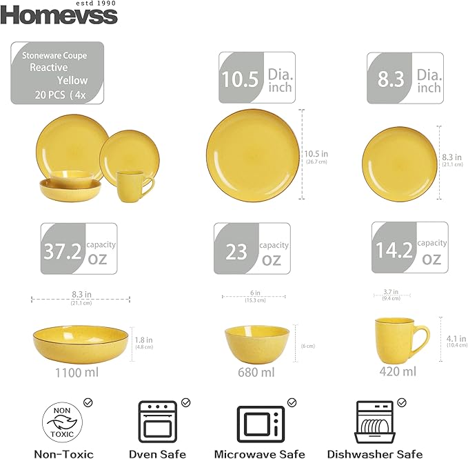 - Service for 4: 20pc Dinnerware Set including 4 of Each Dinner Plate 10.5", Salad Plate 8.5", Soup/Pasta Bowl 8.5"/38oz, Soup/Cereal Bowl 6"/26oz, , Mug 15oz